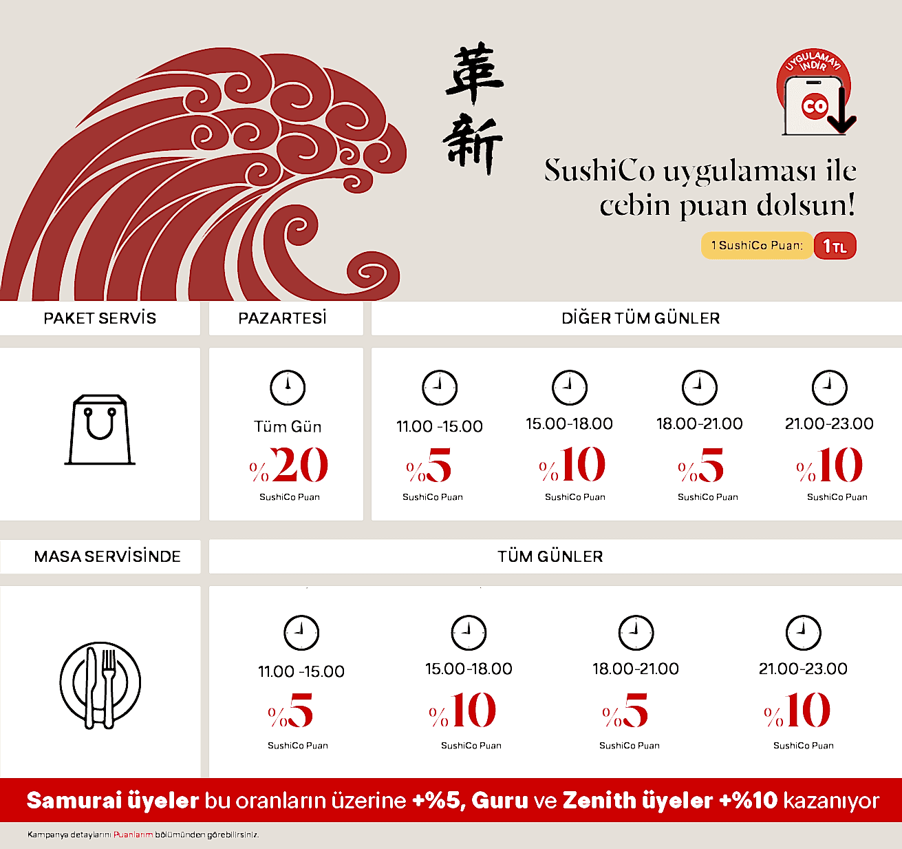 | SAMURAI Samurai (10.001 TL – 20.000 TL): Çıraklıktan kalfalığa geçer gibi; son 12 ay harcaman 10.001 TL – 20.000 TL aralığına ulaştığında SAMURAI seviyesine yükselirsin. Daha fazla puan toplamaya başlarsın: SAMURAI üyeler siparişlerde +%5 ek SushiCo Puan kazanır. | |